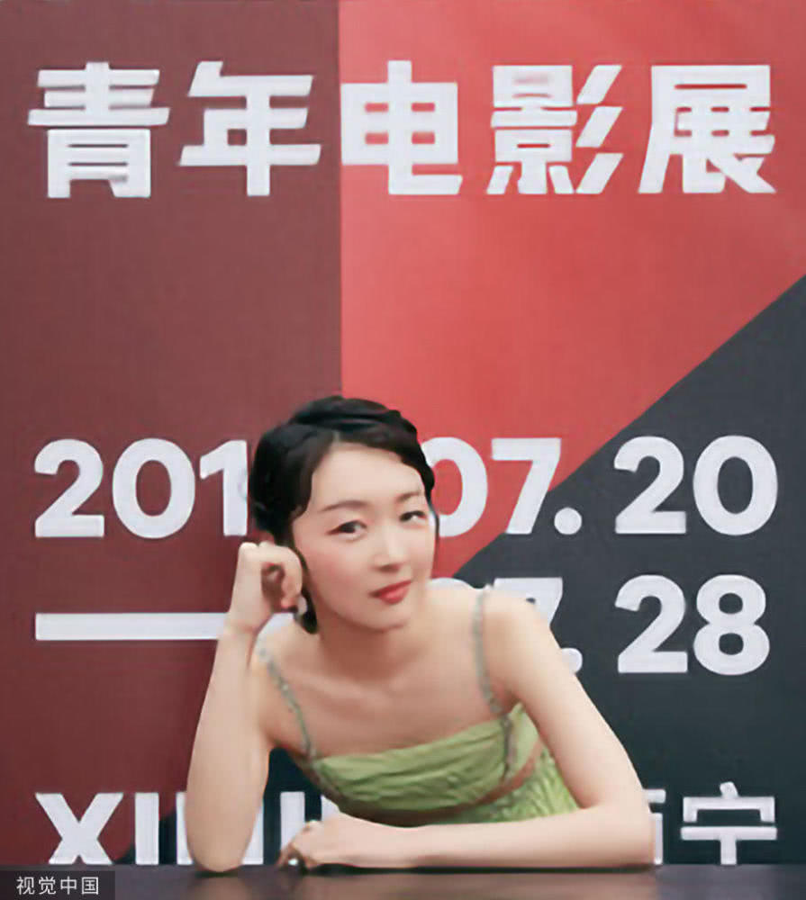 周冬雨穿牛油果绿吊带裙清新可人,趴桌台俏皮摆拍落落大方;图片来源:视觉中国