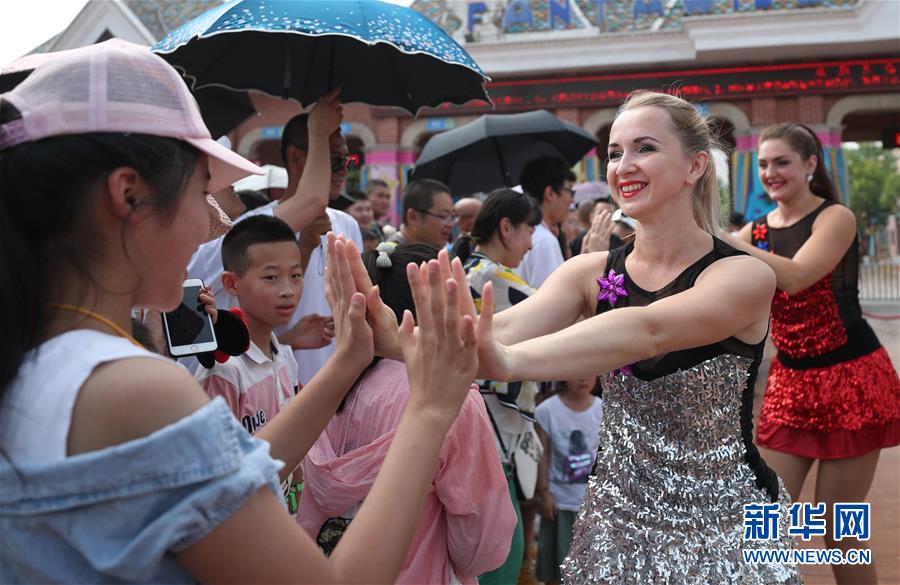 7月31日,列娜(右二)表演后与游客互动。新华社记者龙雷摄
