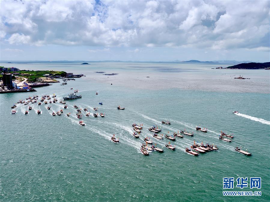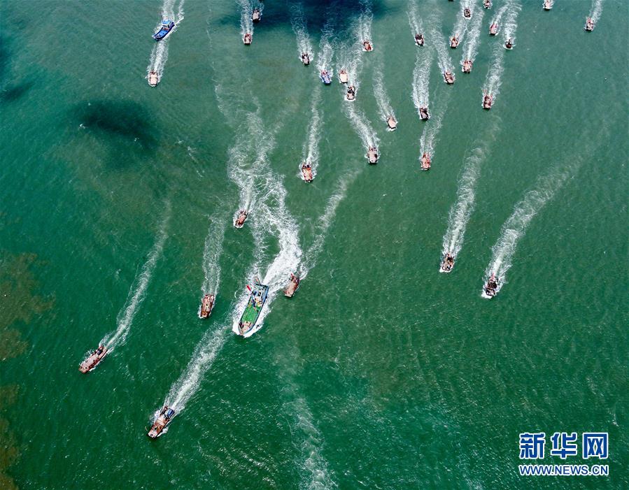 8月3日,在首届福清开渔节上,渔船驶向大海(无人机拍摄)。新华社记者姜克红摄