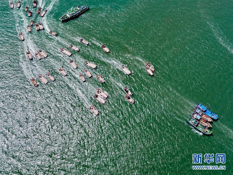 8月3日,首届福清开渔节增殖放流活动上人们在向大海投放鱼苗(无人机拍摄)。