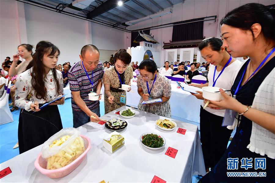 8月3日,在乡村美食文化大赛现场,评委在对菜品进行评定。新华社记者冯大鹏摄