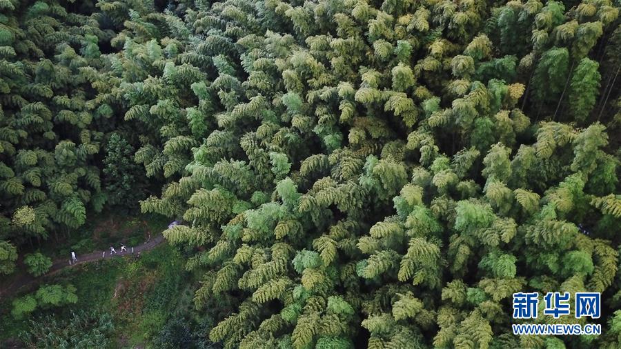 8月3日,游客行走在木坑竹海景区的小路上(无人机拍摄)。夏日,安徽省黄山市黟县的木坑竹海景区风景优美,吸引不少游客前来休闲避暑。新华社记者张端摄