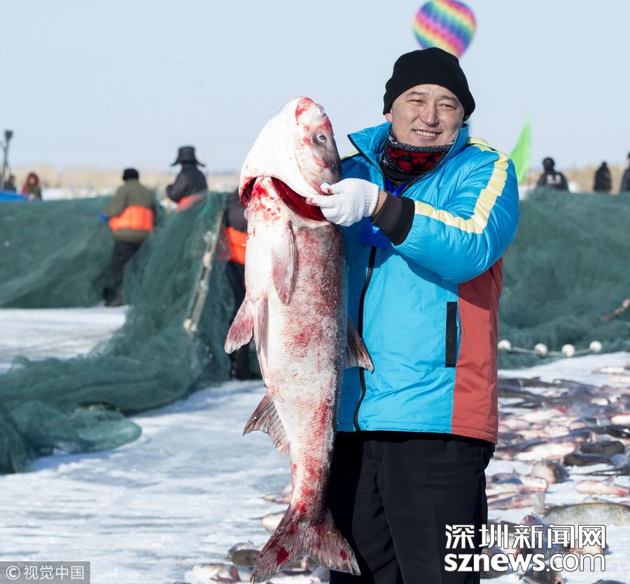 2019年1月21日,新疆阿勒泰,渔民以传统的捕鱼方式,向游客展示“踏雪寻鱼”的捕鱼文化。