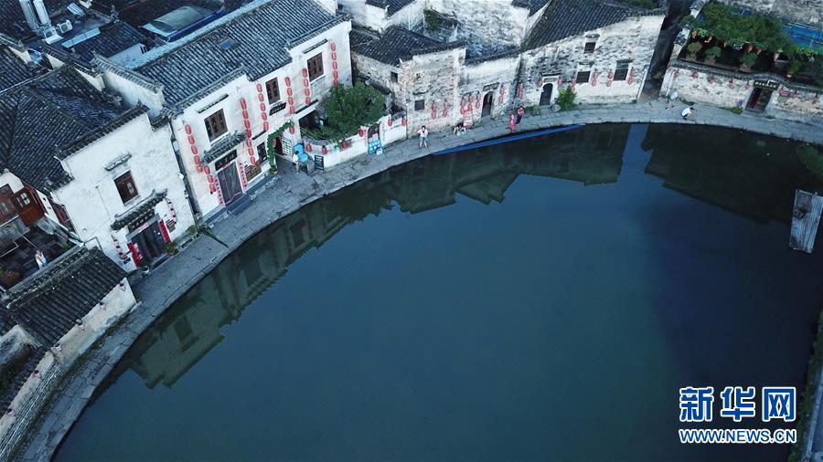 这是8月4日无人机拍摄的安徽黟县宏村风景区月沼晨景。新华社记者 张端 摄