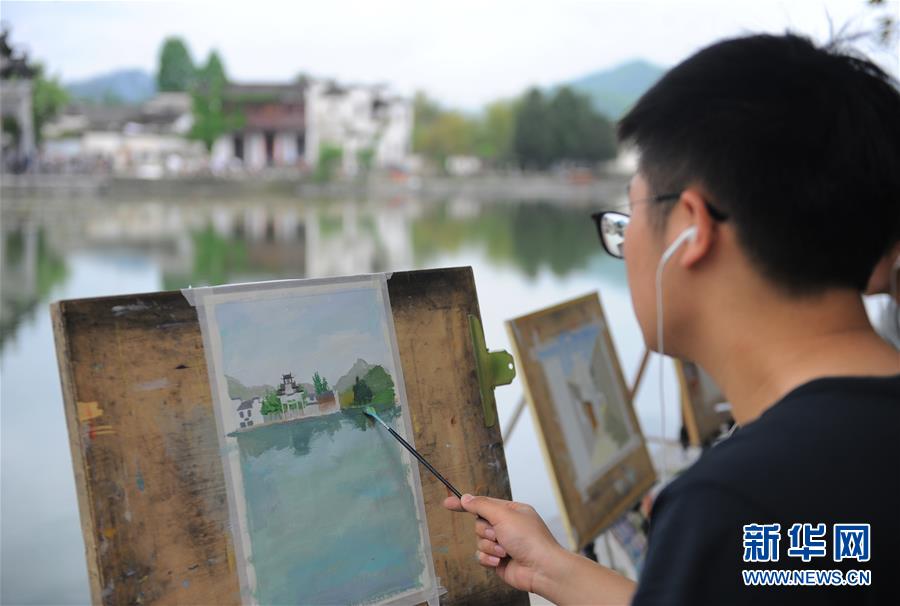 4月24日,绘画爱好者在西递风景区写生。近日,随着气温升高,位于安徽省黟县的古村落西递和宏村春意盎然,景色如画。大批绘画爱好者前来写生,用画笔描绘古村春色。 新华社记者 任鹏飞 摄