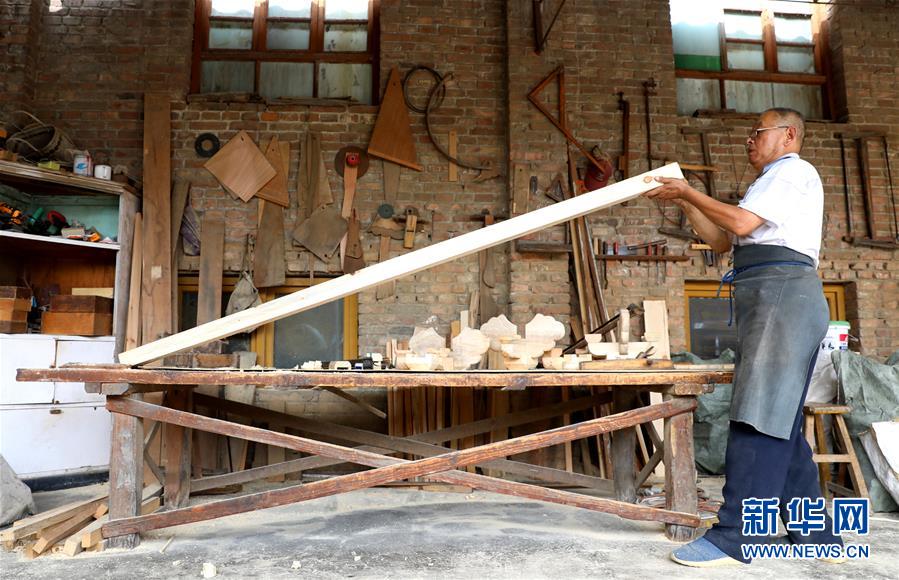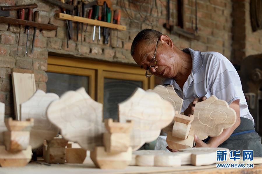 8月7日,在石家庄市井陉矿区横西村,韩保元在检查斗拱。 新华社记者骆学峰摄