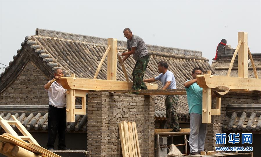 8月7日,在石家庄市井陉矿区横西村,工作人员在组装门楼建筑木架。 新华社记者骆学峰摄