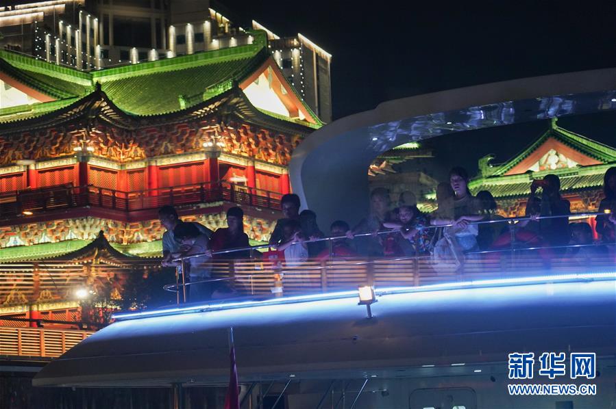 在江西南昌,游客在游轮上欣赏夜景(8月6日摄)。 新华社记者 万象 摄