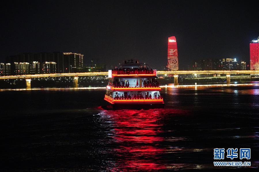 在江西南昌,游客在游轮上观赏夜景(8月6日摄)。 新华社记者周密 摄