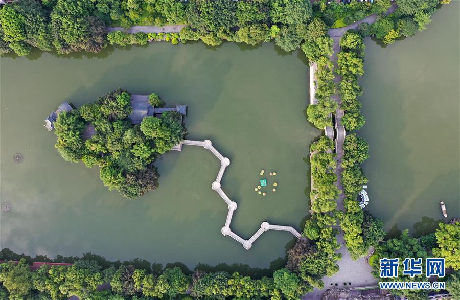 桂林市榕湖景观(7月1日无人机拍摄)。 夏日时节,广西桂林市区内的榕湖、杉湖、桂湖、木龙湖等地绿树成荫、景色迷人。 新华社记者陆波岸摄