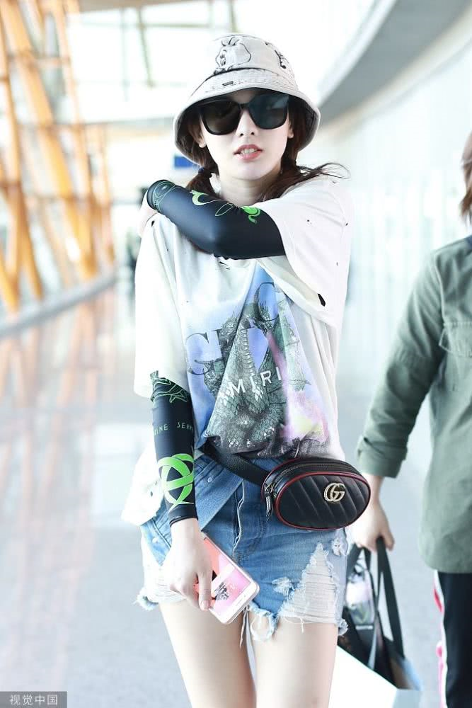 内地女星彭小苒现身机场,穿印花T恤牛仔短裤,白色马丁靴很时髦
