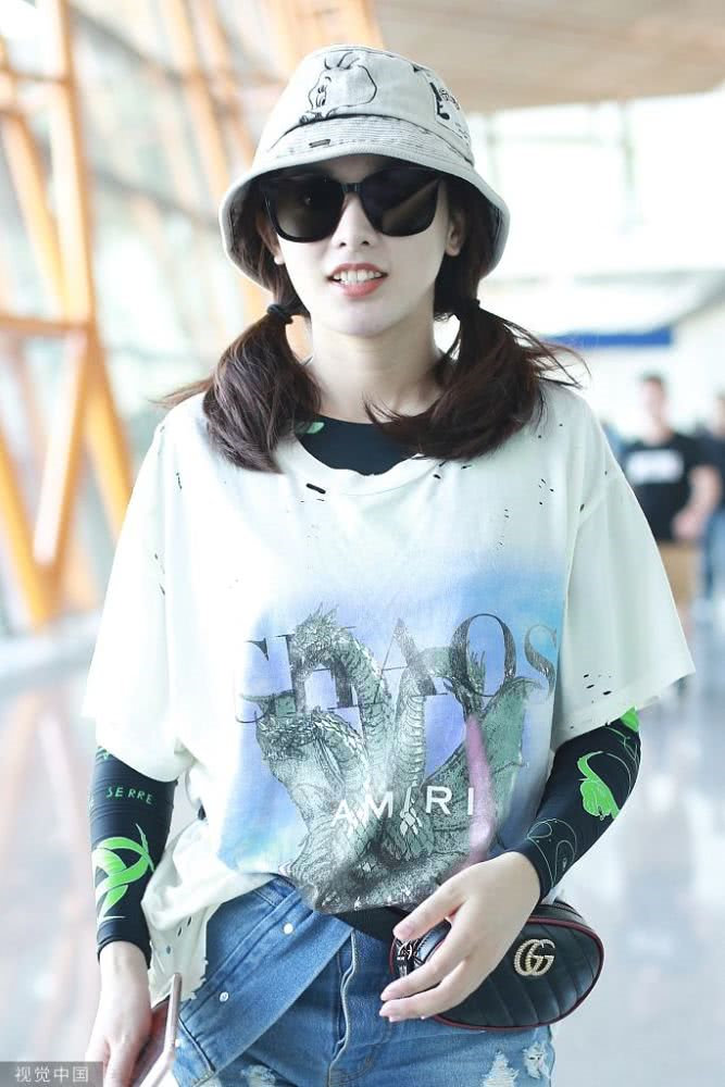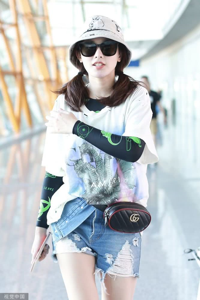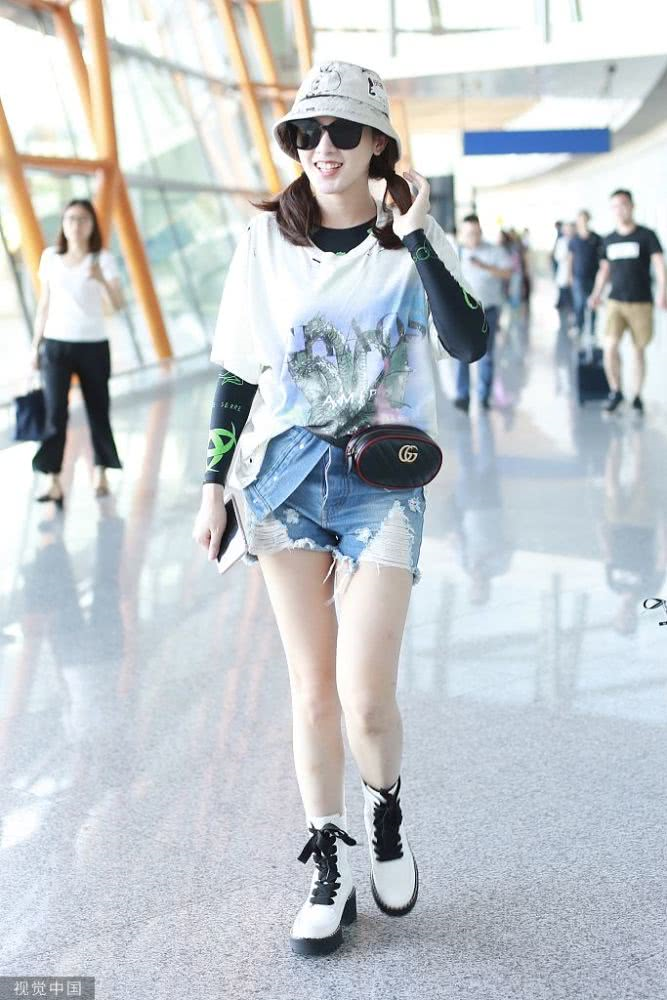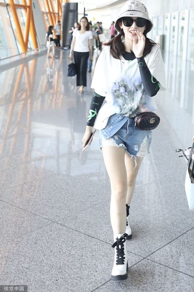 内地女星彭小苒现身机场,穿印花T恤牛仔短裤,白色马丁靴很时髦