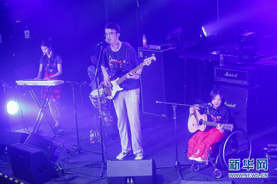 8月14日,8772乐队成员苏佳宇(中)在演唱会上表演。 新华社记者张玉薇摄
