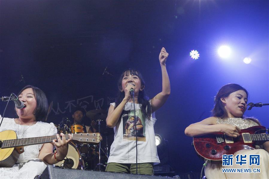 8月14日,8772乐队发起人、队长王奕鸥(中)和乐队成员崔莹(左)、程利婷在演唱会上表演。新华社记者张玉薇摄