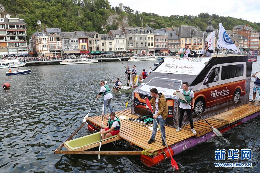 8月15日,在比利时南部小城迪南的默兹河上,人们参加“浴缸划船节”的表演。