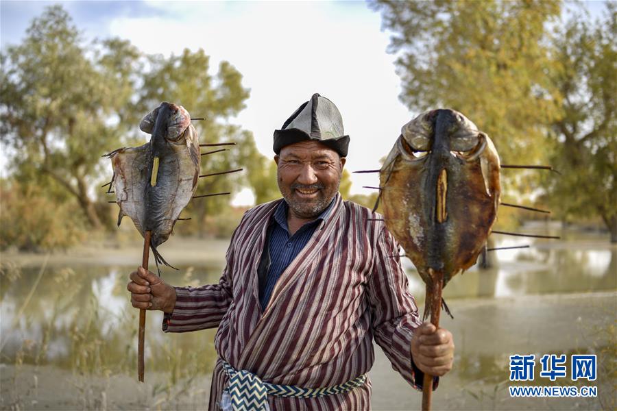 罗布人村寨位于新疆巴音郭楞蒙古自治州尉犁县,塔里木河从这里流过,沙漠、胡杨、湖泊的奇妙组合吸引了不少游客。生活在这里的罗布人阿木东·艾不东更成为大家关注的焦点。 阿木东·艾不东61岁,声音洪亮,面色红润,平时喜欢穿着罗布麻纺织而成的对襟长袍和羊毛毡制成的船形帽子,这是罗布人的传统装扮。 如今,许多罗布人不再以打鱼为生,他们有的放牧,有的种植,有的开设店铺……像阿木东一样在沙漠中渔猎的罗布人已经很少了。 制作罗布人传统美食——红柳烤鱼是阿木东的拿手绝活。一根红柳,穿起一条野鱼,起一堆炭火,撒少许盐巴,就可以静待皮焦肉嫩的红柳烤鱼了。除了传统口味外,阿木东对罗布烤鱼进行了改良。“我秘制了一种烤鱼酱,里面除了辣椒、盐巴、孜然,还有其他佐料。”当问起具体是哪些配方时,阿木东笑着说:“还有就是塔里木河的味道!” 阿木东是一个闲不住的人。旅游旺季过后,他会制作卡盆(胡杨制作的独木舟)模型、胡杨笔筒等,等旺季来临再把这些小物件卖出去。 两千年前,塔里木河与孔雀河载着天山、昆仑山的雪水,把罗布泊充盈得烟波浩渺。罗布人靠罗布泊水域和周围的湿地及原始胡杨林繁衍生息。后来,塔里木河下游河床被风沙淤塞,干旱断绝了绿色。2001年,塔里木河流域近期综合治理项目启动。随着下游河道两岸地下水位的抬升,相当数量的胡杨从死亡的边缘“醒来”,重新护佑这里的绿洲与百姓。 近几年,阿木东生活的地方基础设施大为改善,柏油马路修到了塔里木河畔。前来领略大漠胡杨的游客也越来越多。据了解,截至7月底,尉犁县今年已接待游客78万人次,旅游总收入超过1.1亿元,同比分别增长63.14%和119.42%。 新华社记者 赵戈 摄