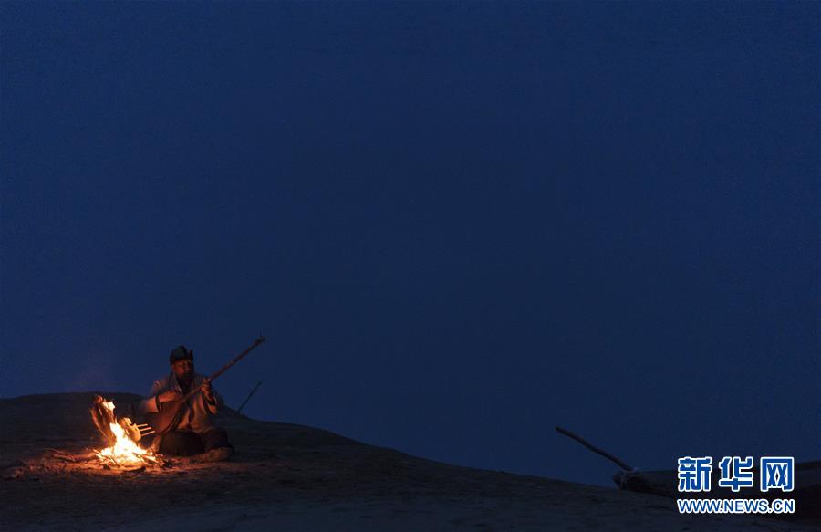 在罗布人村寨,阿木东·艾不东在沙漠里的一处海子旁弹奏乐器,等待烤鱼烤熟(4月11日摄)。新华社记者 费茂华 摄