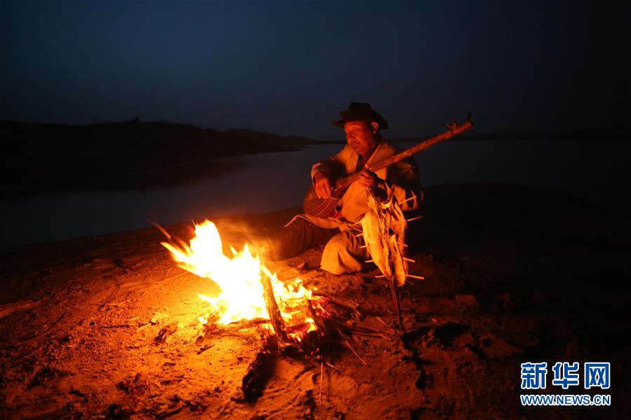 在罗布人村寨,阿木东·艾不东在沙漠里的一处海子旁弹奏乐器,等待烤鱼烤熟(4月11日摄)。新华社记者 卢烨 摄