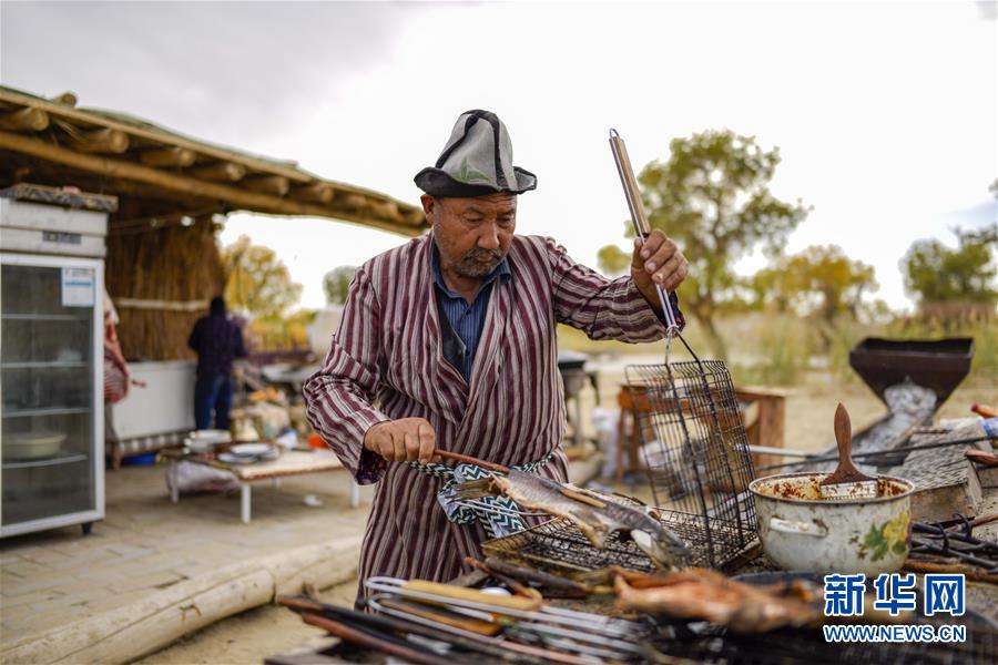 在罗布人村寨,阿木东·艾不东在家中制作罗布烤鱼(2018年10月16日摄)。新华社记者 赵戈 摄