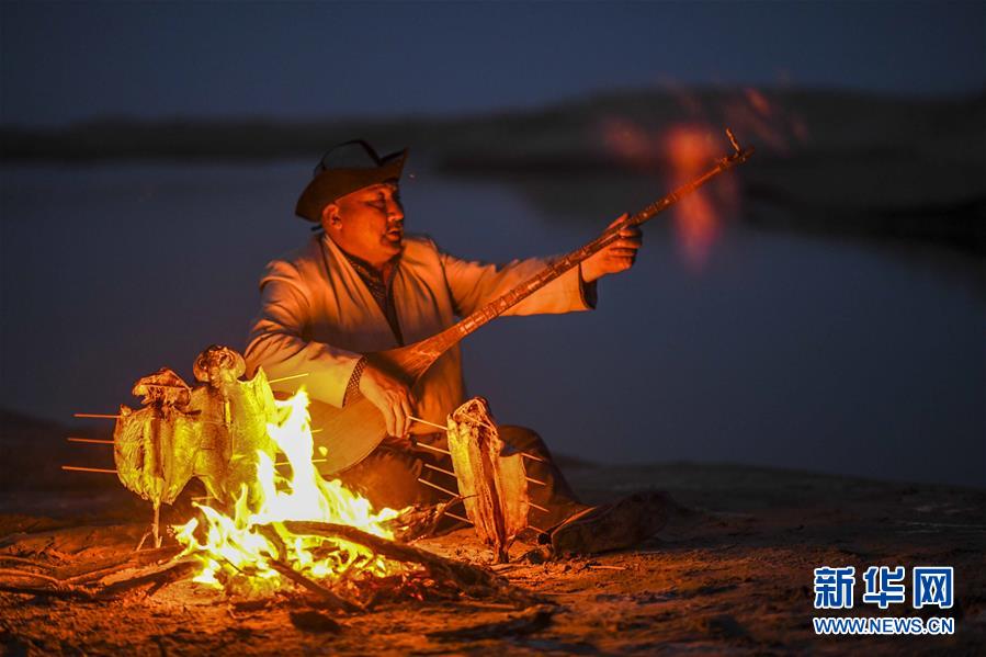 在罗布人村寨,阿木东·艾不东在沙漠里的一处海子旁弹奏乐器,等待烤鱼烤熟(4月11日摄)。新华社记者 赵戈 摄