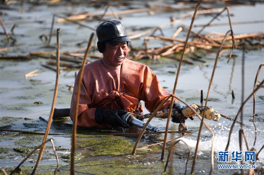 王公平每天泡在冰冷的水中劳动9个小时,挖藕约1000斤,获得酬劳约300元。寒冬时节,安徽省肥西县丰乐镇莲藕种植基地里活跃着不少挖藕人,他们身穿橡胶工作服,在冰冷的水中辛勤工作。