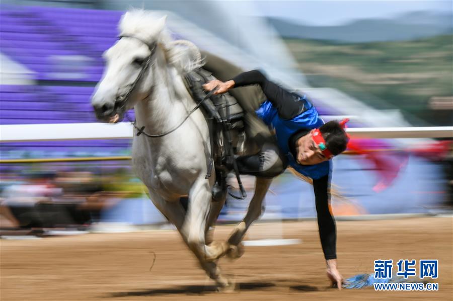 8月20日,骑手在“蒙古马”传统技巧表演中展示骑马拾哈达。 新华社记者 彭源 摄