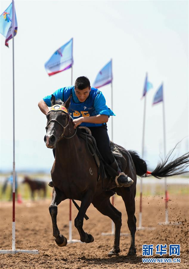 8月20日,骑手在“蒙古马”传统技巧表演中展示骑马穿桩。 新华社记者 彭源 摄
