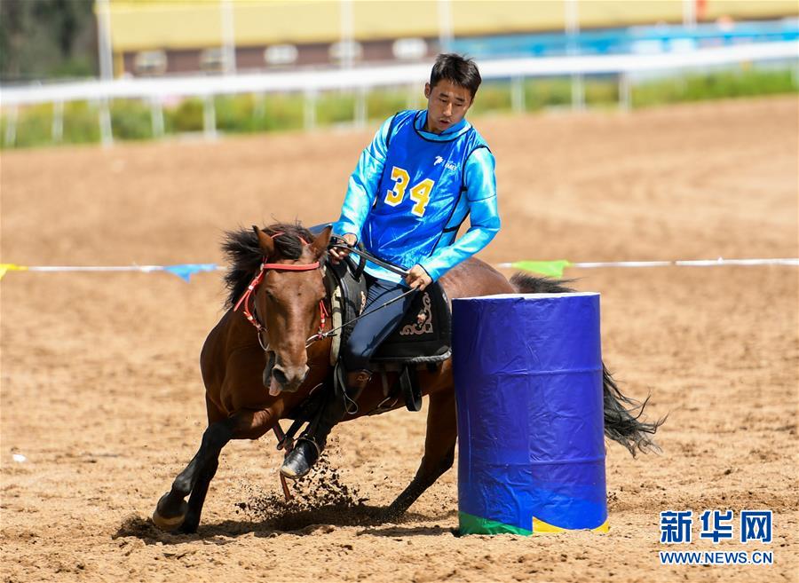 8月20日,骑手在“蒙古马”传统技巧表演中展示骑马绕桶。 新华社记者 彭源 摄