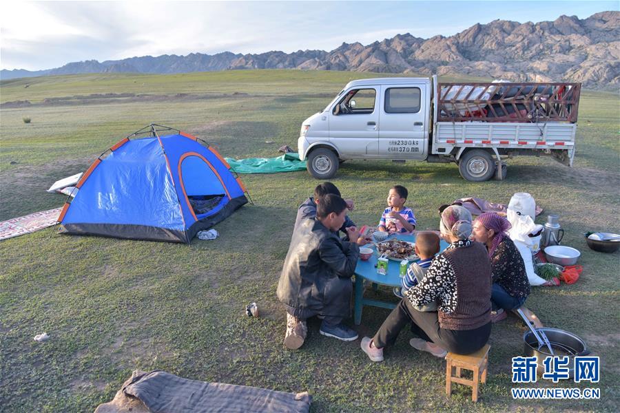 在新疆阿勒泰地区福海县,牧民在转场途中吃晚餐(6月5日摄)。新华社记者丁磊摄