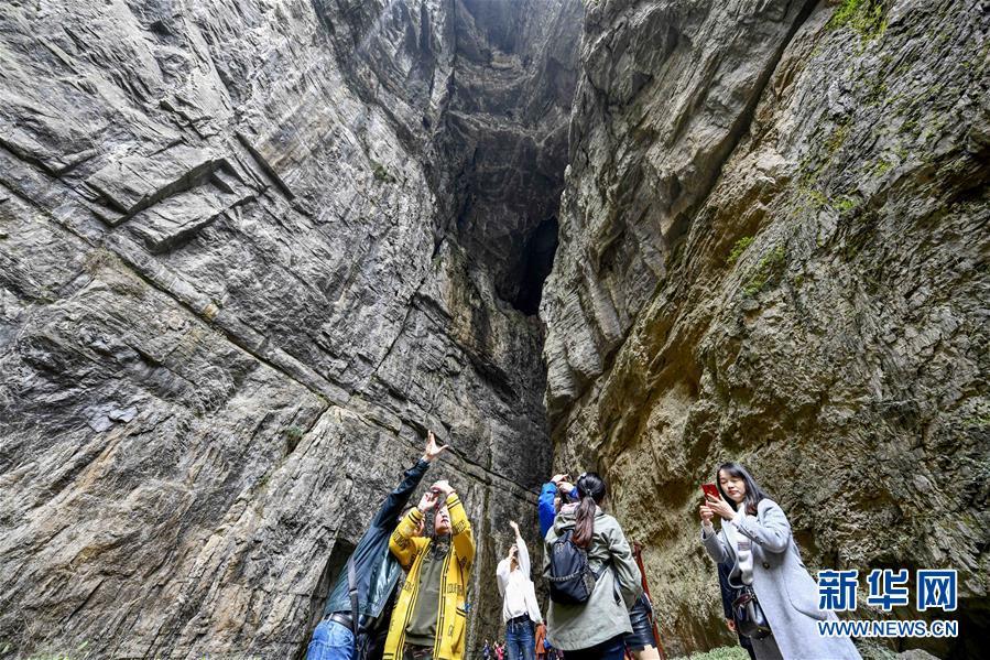 游客在天生三桥景区内的黑龙桥景点游览(3月27日摄)。 新华社记者刘潺摄