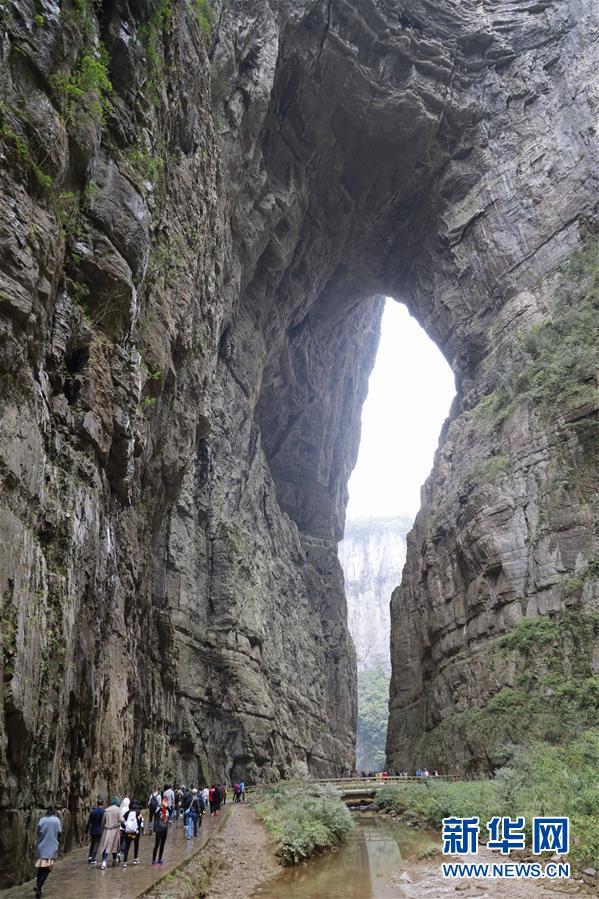 游客在天生三桥景区内的青龙桥景点游览(3月27日摄)。 新华社记者刘潺摄