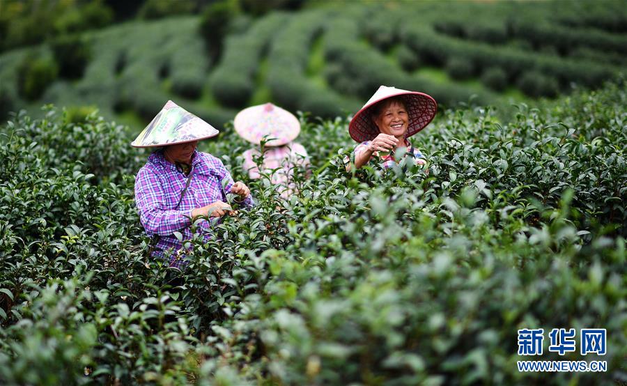 五指山市水满乡毛脑村贫困户王金花(右一)在五指山椰仙茶园采茶,她在2012年进入茶园工作,2016年脱贫(2018年11月15日摄)。新华社记者郭程摄