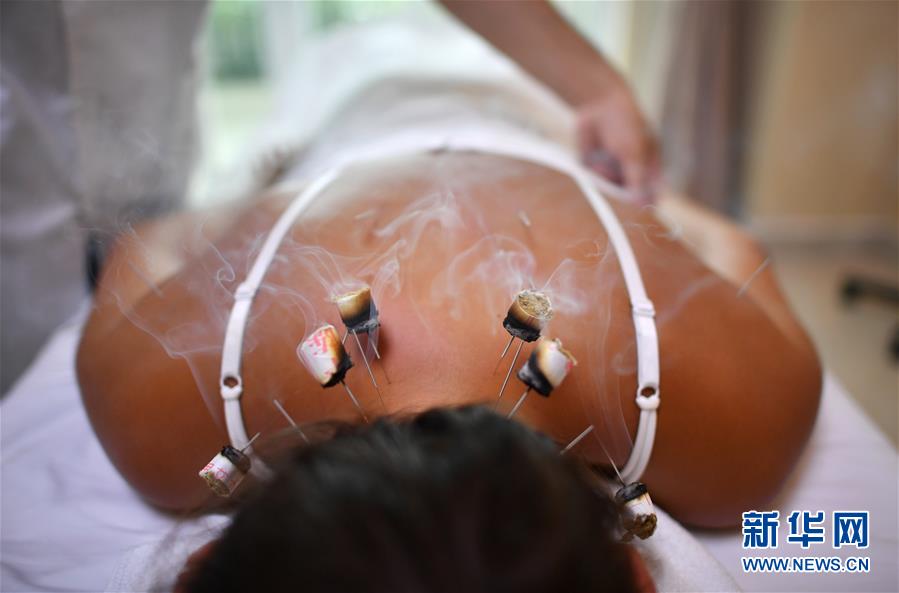 俄罗斯游客维多利亚·米哈拉普在三亚国际友好中医疗养院进行中医理疗(2018年6月2日摄)。新华社记者郭程摄
