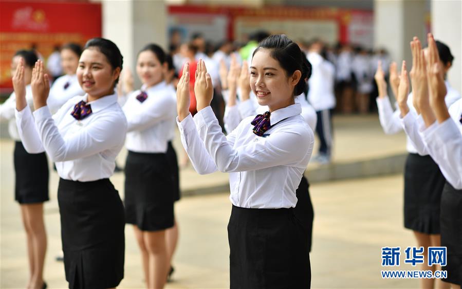 海南省旅游学校礼仪队的学生在上礼仪课(2018年4月20日摄)。新华社记者郭程摄