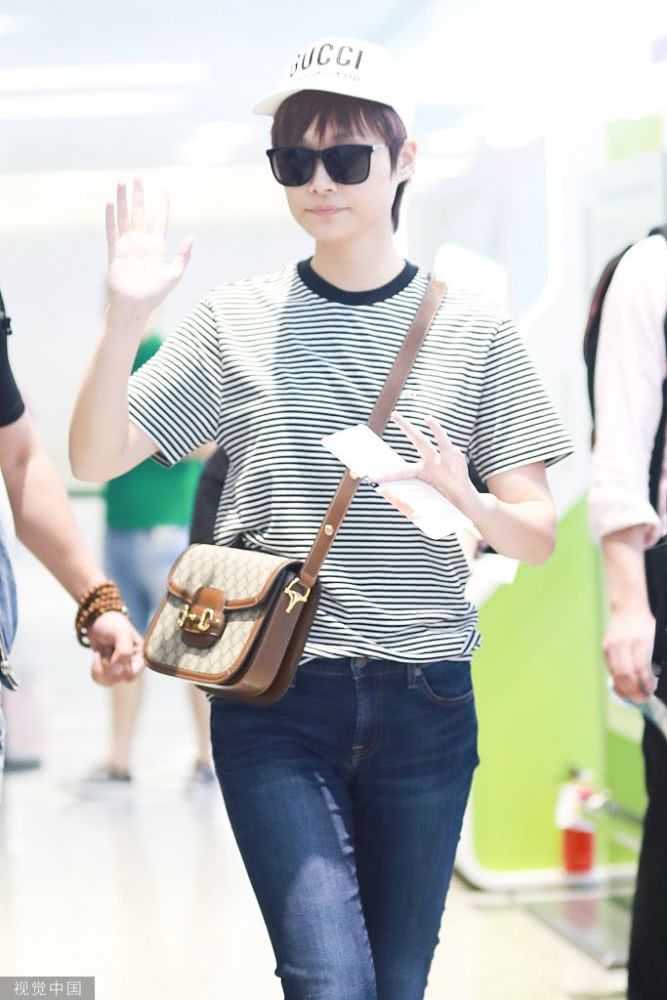 她身穿条纹T恤搭配牛仔裤,青春活力。头戴棒球帽,黑超遮面,又不失酷感。