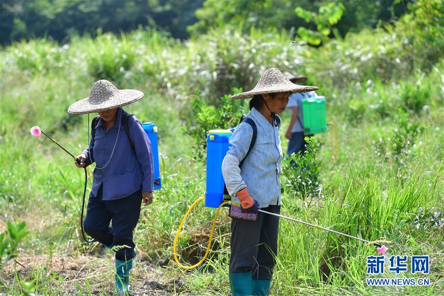 在广西融安县大良镇古兰村古兰屯金桔种植基地,村民在田间管护金桔树(8月18日摄)。 新华社记者 黄孝邦 摄