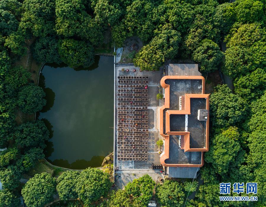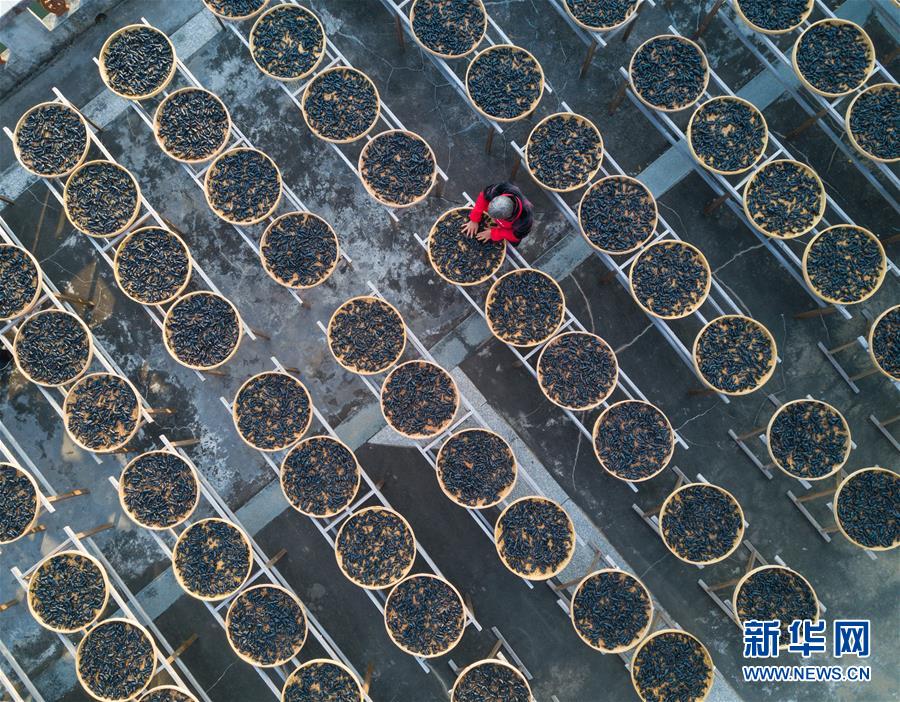 在福建省永春县岵山镇茂霞村熟地文创园,村民在晾晒用当地传统手艺制作的药材——熟地(1月28日无人机拍摄)。 新华社记者 宋为伟 摄