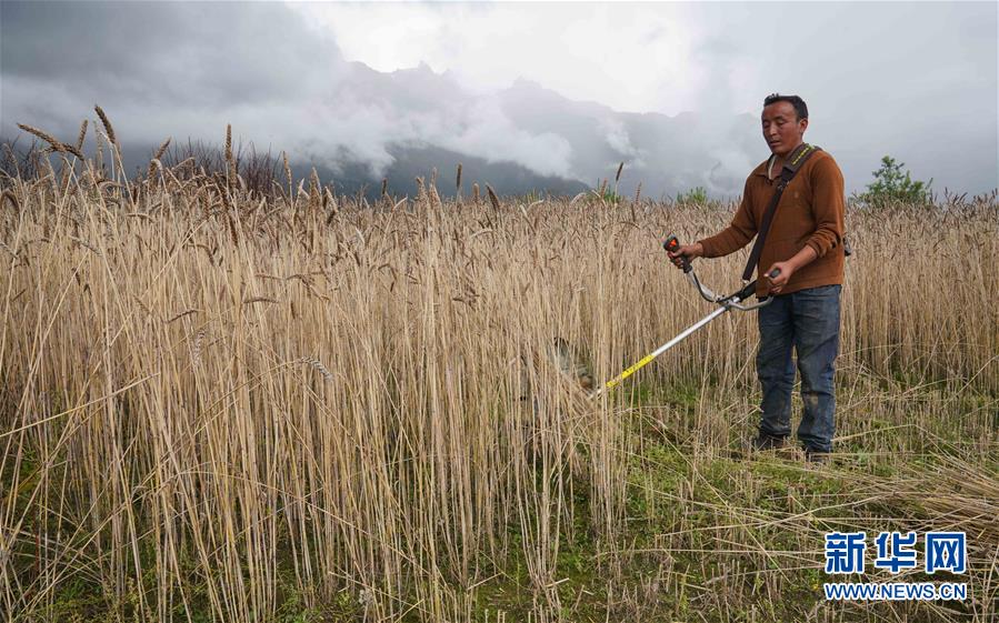 乃村村委会主任多吉顿珠在自家田地里收割小麦(8月26日摄)。新华社记者 多吉占堆 摄