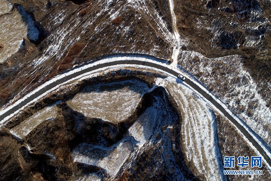 车辆行驶在王庄沟村通往大有乡的道路上(2月16日无人机拍摄)。 新华社记者 詹彦 摄