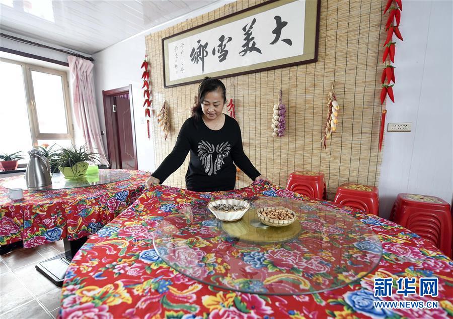 在舒兰市二合屯,何翠华在自家农家乐内整理桌布(1月25日摄)。二合雪乡的发展让二合屯村民何翠华将“农闲”变为“农忙”,一个雪季能够收入近4万元。 新华社记者许畅摄