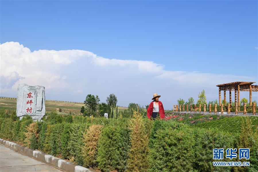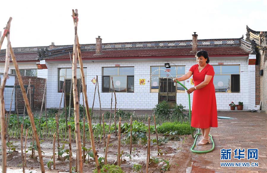 东坪村村民郭金兰在新房的院子里浇水(6月13日摄)。 新华社记者 杨晨光 摄