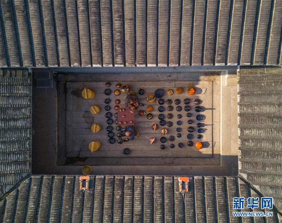 在福建省永春县仙夹镇龙水村,村民在老宅制作当地特色漆篮(1月28日无人机拍摄)。 新华社记者 宋为伟 摄
