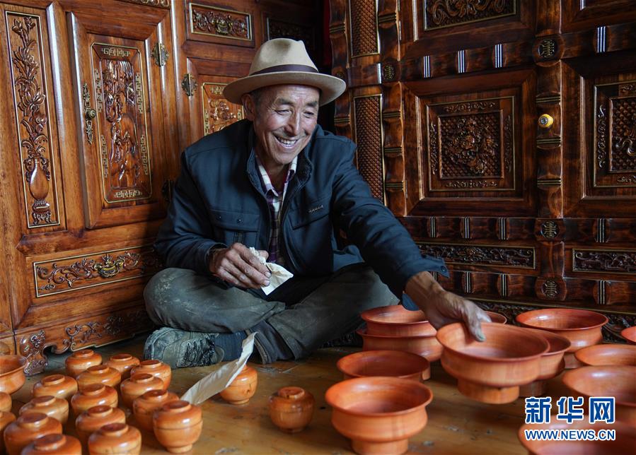 乃村村民次旺多吉在擦拭自己新近制作的木碗(8月26日摄)。新华社记者 多吉占堆 摄