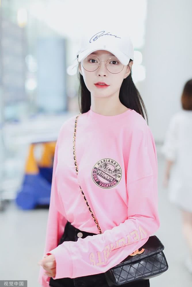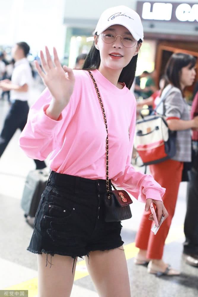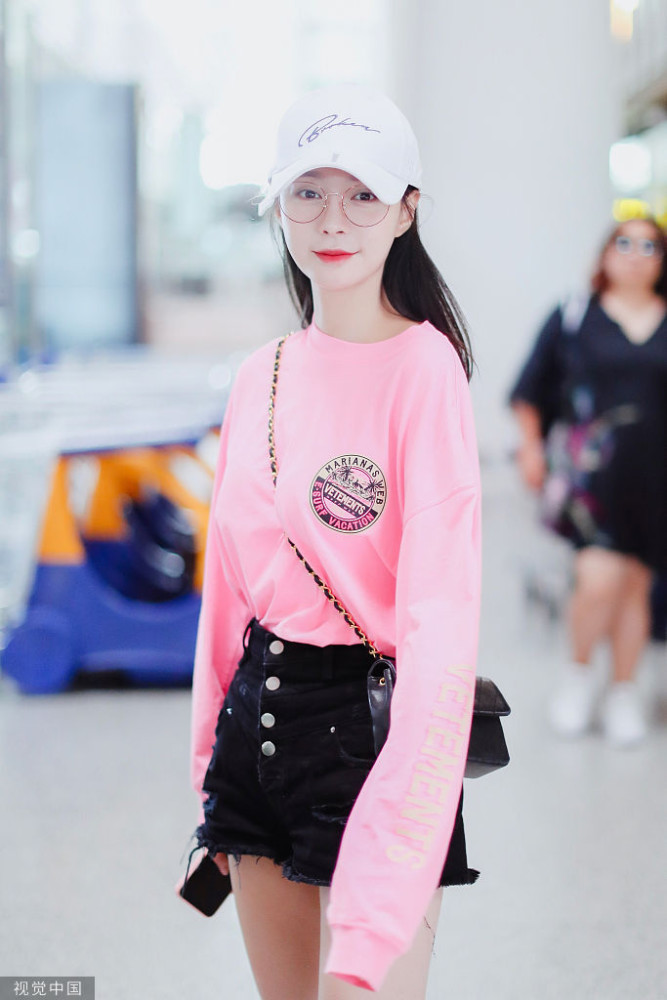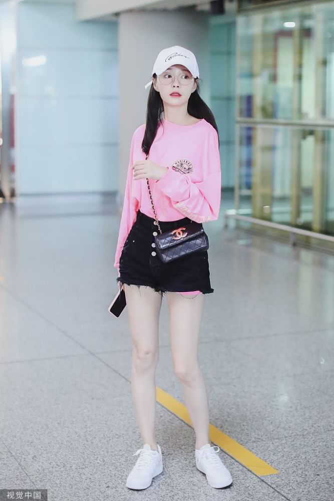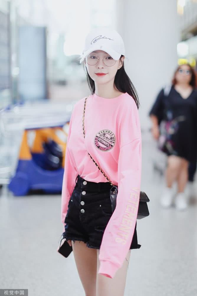 她戴着棒球帽身穿粉色卫衣搭配热裤,长腿纤细又白嫩。
