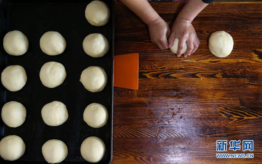 8月29日,付艳梅将发酵好的面团揉捏成型。新华社记者淡航摄