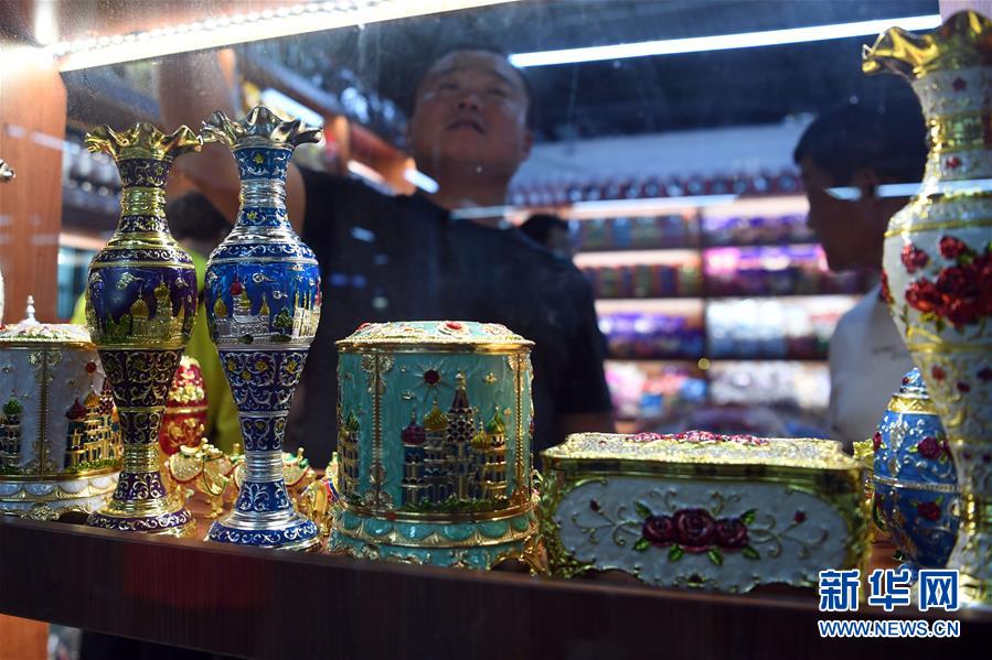 9月4日,在新疆塔城地区巴克图口岸,顾客在丝路文化商品城内选购商品。 新华社记者程丽摄