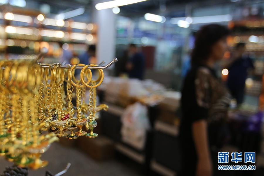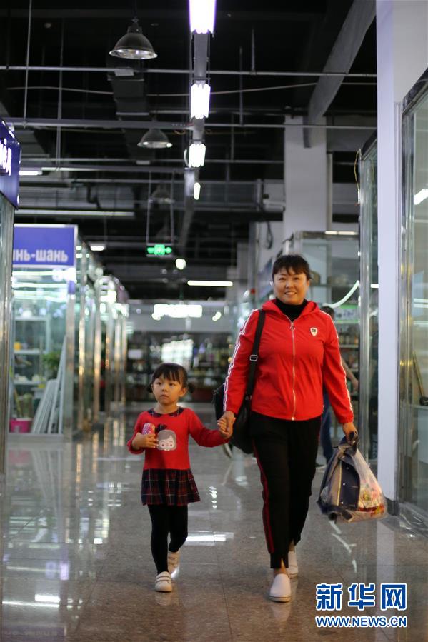 9月4日,在新疆塔城地区巴克图口岸,塔城居民黄金瑞带着女儿在丝路文化商品城内采购。 新华社记者程丽摄