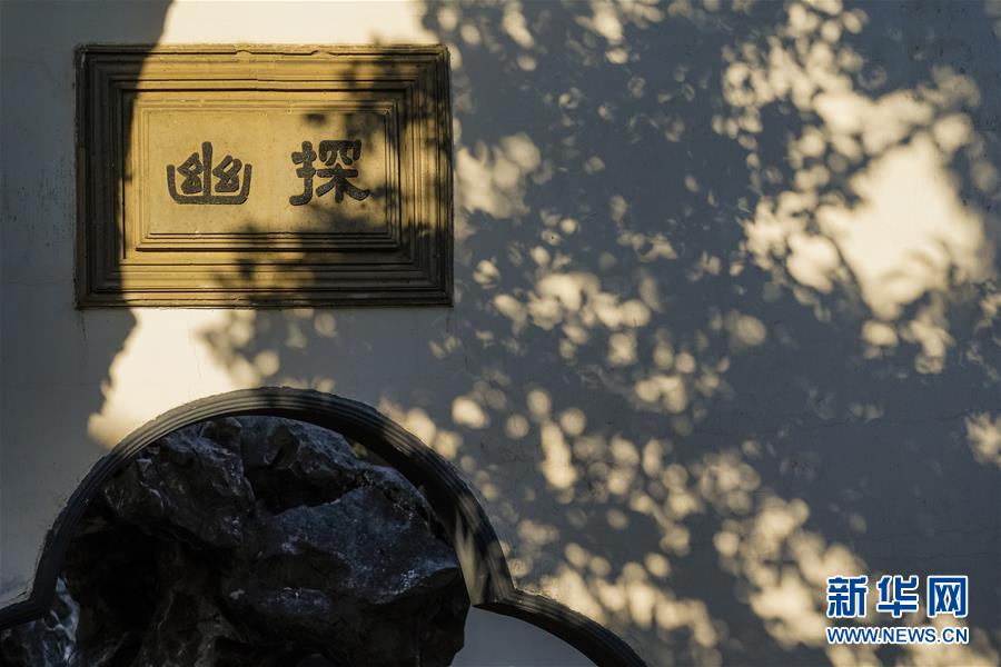 这是苏州狮子林墙壁上的斑驳树影(5月23日摄)。 新华社记者 沈伯韩 摄