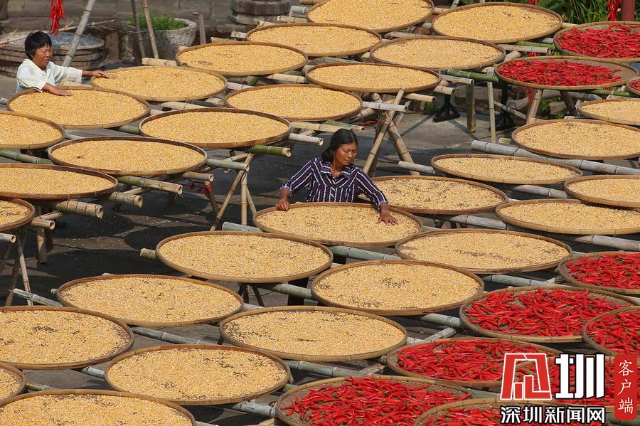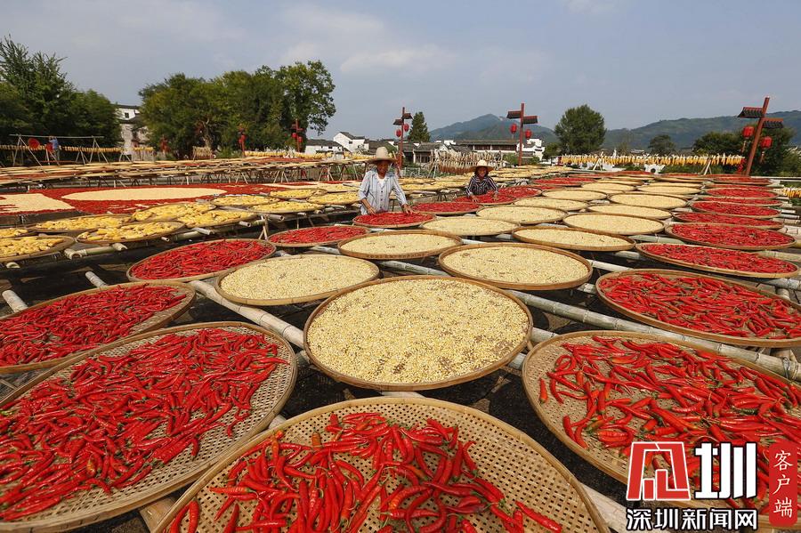 秋天,是收获的季节。安徽省黄山市呈坎古村村民将收获归仓的玉米、黄豆、红辣椒等农作物果实因地制宜晾晒,在古村晒场上描绘出一幅丰收晒秋图。