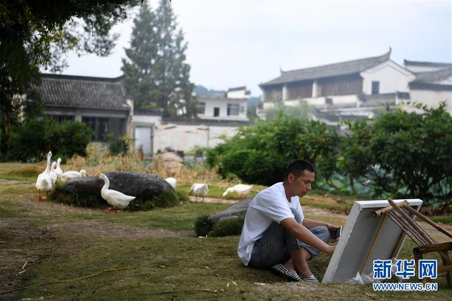 游客在呈坎村内写生(8月28日摄)。新华社记者刘军喜摄